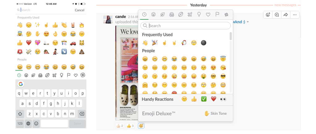 I also worked on the creation of Reactions, or as they're sometimes called Reacjis. A solution that allowed for members of a team to quickly respond to a message. Whether that to say, yes I'm working on it, or to show joy when something great happens within a team. It was a means to go beyond just a like button.